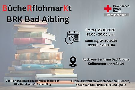 Halbjährlicher Bücherflohmarkt der BRK Bereitschaft Bad Aibling. Wie immer gibt es ein breites Angebot an Büchern aller Genres. Der Erlös bleibt zu 100% bei der BRK Bereitschaft Bad Aibling und wird für die ehrenamtlichen Zwecke verwendet.
