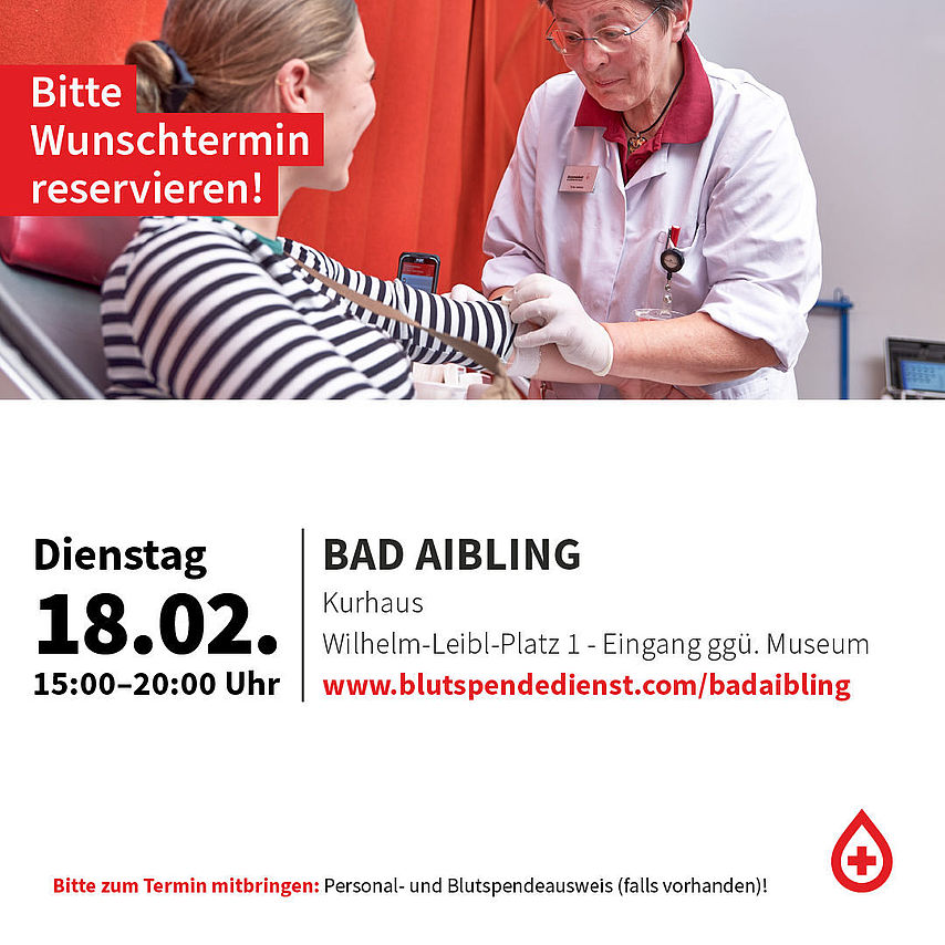 In Zusammenarbeit mit dem Blutspendedienst des Bayerischen Roten Kreuzes ermöglichen wir es der Bevölkerung alle zwei Monate in Bad Aibling Blut zu spenden.